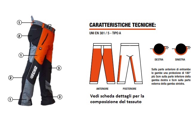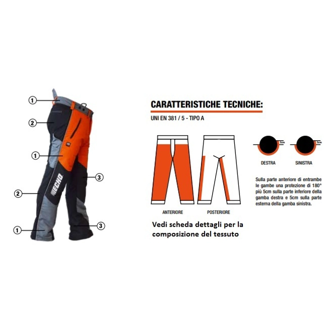 Pantalone antitaglio Echo Classe 1 - Codice ECASG1180.Pantaloni antitaglio con protezioni sulle gambe per professionisti, comodi, leggeri e super resistenti, realizzati in collaborazione con il noto produttore Siggi.Sulla parte anteriore di entrambe le gambe è presente una protezione a 180°.Una protezione di 5 cm è presente anche sulla parte inferiore esterna della gamba destra e della gamba sinistra.