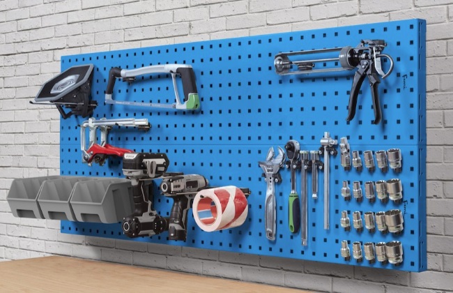 Soluzione composta da due pannelli porta utensili con foro quadro 10x10 mm. che, grazie alle pratiche staffe, possono essere installati direttamente a parete per l'organizzazione e la visione immediata di attrezzi e utensili utilizzati quotidianamente.