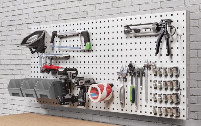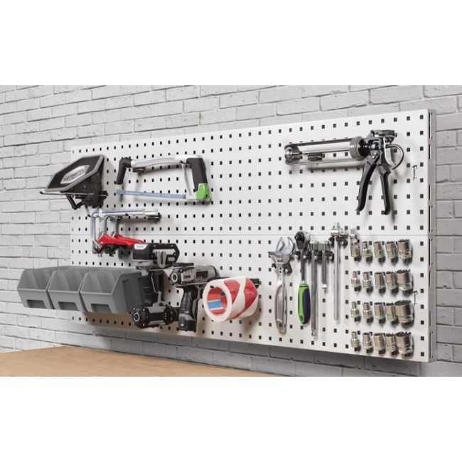Soluzione composta da due pannelli porta utensili con foro quadro 10x10 mm. che, grazie alle pratiche staffe, possono essere installati direttamente a parete per l'organizzazione e la visione immediata di attrezzi e utensili utilizzati quotidianamente.
