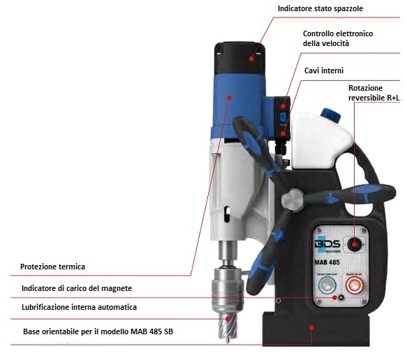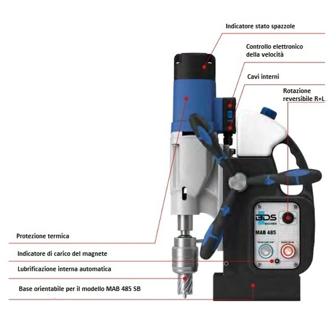 Trapano perforatore a base elettromagnetica serie "Profiplus" MAB 485. Cod. 0068718. Indispensabile in officina, nelle fasi di produzione e assemblaggio. La macchina è destinata a lavori di perforazione di metalli magnetici e non magnetici e lavori di maschiatura, svasatura e alesatura. CaratteristicheProtezione contro il surriscaldamentoIndicatore del magneteLubrificazione interna permanenteOpzione base girevole sul modello MAB 485 SBIndicatore di usura delle spazzole di carboneElettronica di controllo a onda interaAlimentazione interna del cavoMotore reversibileInterruttore ON/OFF motore.Interruttore ON/OFF magnete.ImpieghiPerforazione con punte elicoidali, perforazione con corona carotatrice, maschiatura, alesatura/svasatura). FINO AD ESAURIMENTO SCORTE LE MACCHINE POTREBBERO ESSERE FORNITE COME DA DESIGN PRECEDENTE.LE CARATTERISTICHE TECNICHE RIMANGONO INVARIATE.