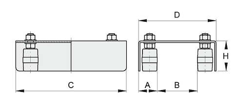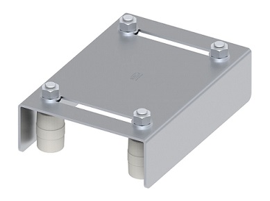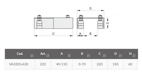 Piastra di guida superiore regolabile - Articolo 222. Con 4 olive in nylon ad asola unica VA3101.A30. Realizzato in acciaio zincato. Per cancelli. Fissaggio tramite saldatura. Dimensioni come da schema.