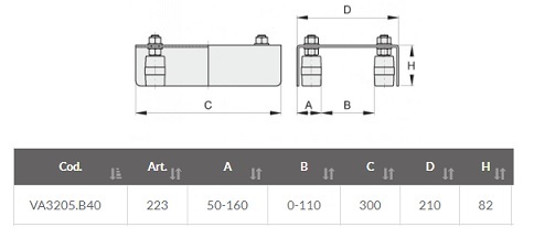 Piastra di guida superiore regolabile - Articolo 223. Con 4 olive in nylon ad asola unica VA3101.B40. Realizzato in acciaio zincato. Per cancelli. Fissaggio tramite saldatura. Dimensioni come da schema.