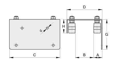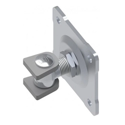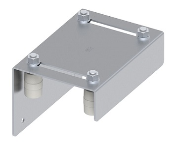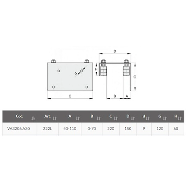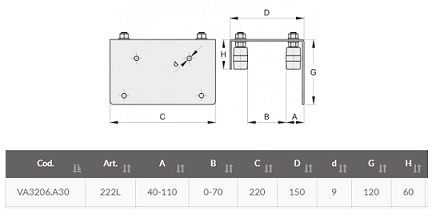 Piastra di guida superiore regolabile - Articolo 222L. Con 4 olive in nylon ad asola unica VA3101.A30. Realizzato in acciaio zincato. Per cancelli. Fissaggio a muro tramite viti e tasselli (non inclusi). Dimensioni come da schema.