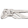 Pinza chiave XLDIN ISO 5743Combinazione di pinza e chiave in un unico utensile. L'utensile di montaggio unico nel suo genere disponibile anche nella lunghezza di 400 mm. Per aperture chiave fino a 85 mm. o 3 3/8". Le chiavi a bocca con apertura fissa per raccordi di grandi dimensioni sono particolarmente costose. In tale ambito, KNIPEX con sua la pinza chiave XL con apertura bocca regolabile fino a SW 85 mm / 3 3/8" offre un enorme potenziale di risparmio. Caratteristiche Realizzata in acciaio al cromo vanadio, forgiato, temperato ad olio. Esecuzione cromata. Manici rivestiti in resina sintetica.I becchi sono piatti, anche per il montaggio delicato di raccordi a vite di qualità pregiata in ottone, ottone rosso o acciaio inox. Utensile regolabile per avvitatura. Sostituisce varie chiavi a forchetta fino a 85 mm. o 3 3/8". Adattamento ottimale al pezzo con comoda impugnatura. Nessun danneggiamento degli spigoli su installazioni sanitarie con superfici delicate tramite l'ampia superficie di serraggio senza gioco. La regolazione si effettua mediante pressione sul pulsante direttamente sul pezzo in lavorazione. Le ganasce parallele, permettono di serrare in continuo tutte le aperture fino alla capacità indicata. Nessuno spostamento accidentale della regolazione, grazie allo scatto sicuro del perno cerniera. La corsa fra le superfici delle ganasce consente di serrare e allentare rapidamente col sistema a cricchetto. La presa di serraggio è altissima, tramite la trasmissione di forza moltiplicata 10 volte.