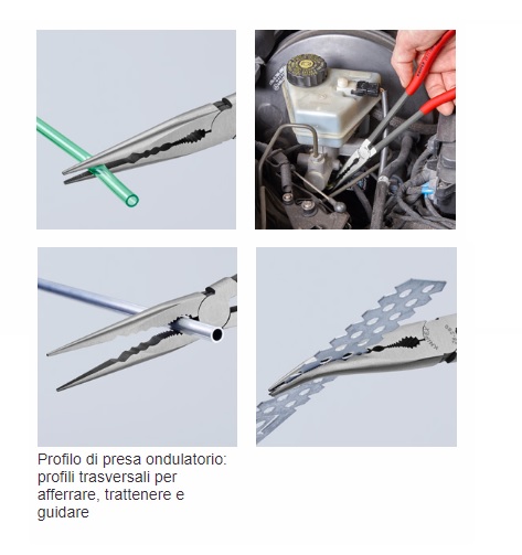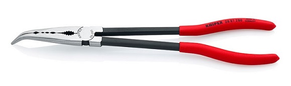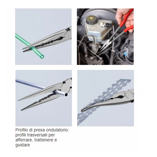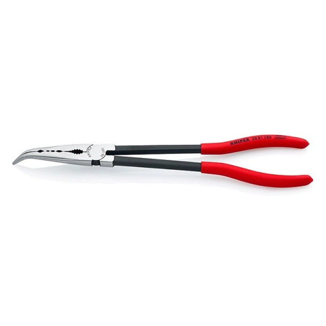 Pinze per meccanica Knipex con profili trasversali e becchi incurvati a 45° Knipex - Art.2881280. DIN UNI 5745. Pinza bonderizzata nera, testa pulita, manici rivestiti in resina sintetica. Caratteristiche Per lavori di presa, messa a punto e montaggio in punti difficilmente accessibili, grazie alla struttura affusolata e particolarmente lunga. I becchi mezzotondi, stretti raggiungono in modo ottimale anche i pezzi più in profondità. Afferrare, trattenere e guidare in modo delicato e nonostante sicuro piccoli tubi di rame, viti e cavi nonché altri componenti di forma tonda tramite la scanalatura fresata con superfici lisce. Incavo dentato per afferrare i pezzi tondi. Particolarmente adatta per lavori nelle autofficine (ad es. nel vano motore), lavori di montaggio e costruzione di macchinari. Utensile affusolato e ciò nonostante robusto. Forgiato di acciaio speciale, temperato ad olio.