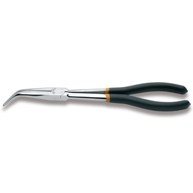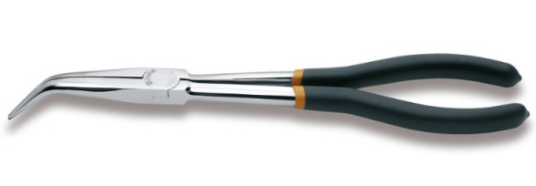 Pinza a becchi mezzotondi lunghissimi zigrinati piegati a 45°.