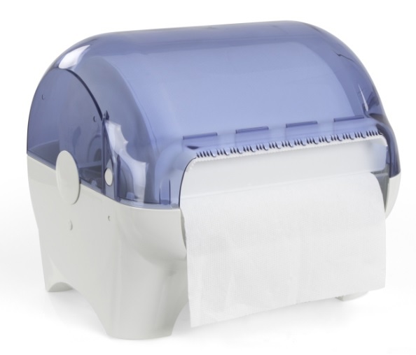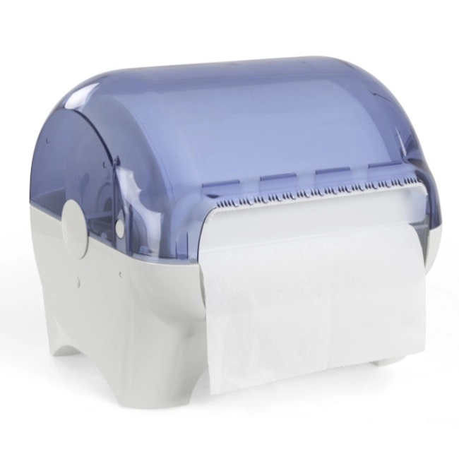 Dispenser portarotolo in plastica, carenato trasparente.
