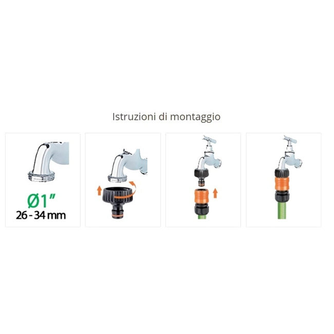 Presa rubinetto 1" - art. Claber 8628. Per collegare un raccordo a un rubinetto da 1" (26-34 mm.). Si installa senza usare alcun attrezzo. Assicura un collegamento stabile e senza perdite. Il suo design ergonomico rende facile e comodo l'utilizzo anche con le dita bagnate. Compatibile con i raccordi automatici Quick-Click. Fornita sfusa (senza blister).