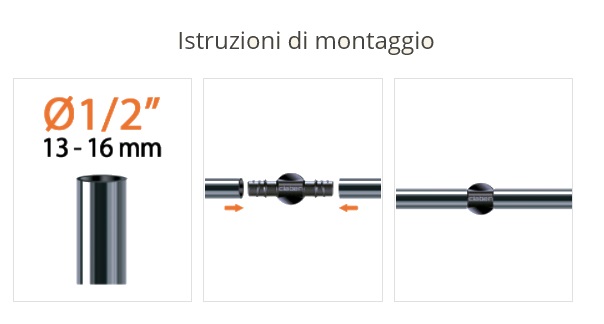 Raccordo di prolunga - art. Claber 91076. Consente di creare impianti di qualsiasi lunghezza, raccordando più spezzoni di tubo collettore da 1/2" (13 - 16 mm.). Fornito in blister da 4 pezzi.