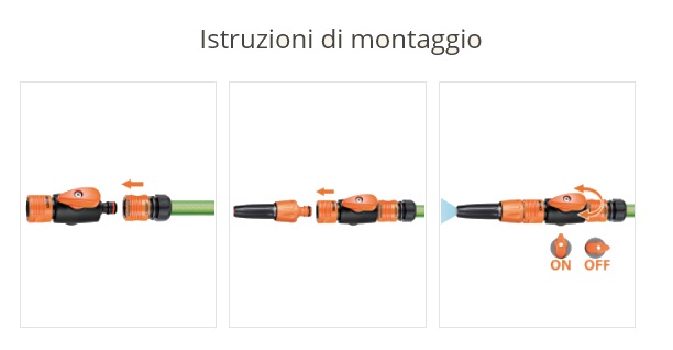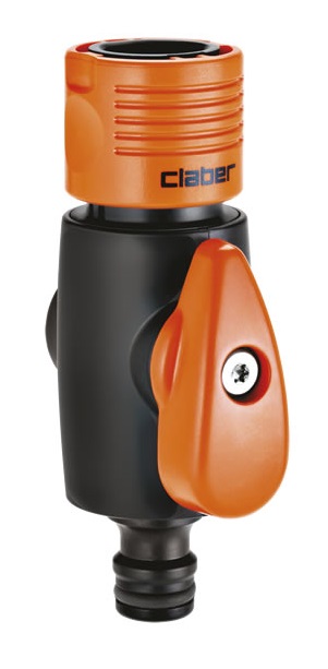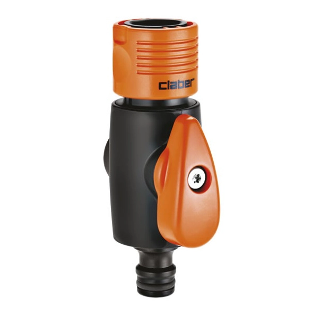 Raccordo con rubinetto. Si utilizza per unire due tubi flessibili. Inoltre a manopola ergonomica, permette aprire e chiudere il getto e di regolare a piacimento la portata d'acqua. Compatibile con i raccordi automatici Quick-Click.