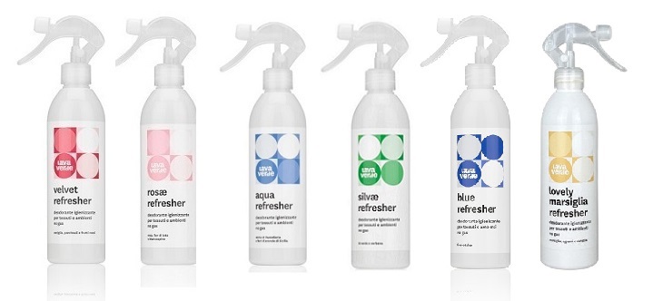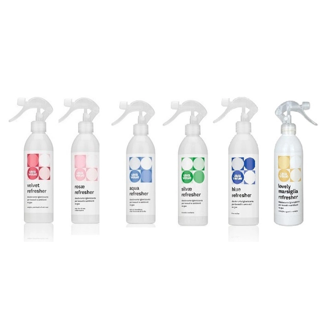 Fragranze:VELVET REFRESHER: vaniglia, patchouli e frutti rossi.ROSAE REFRESHER: rosa, fior di loto e biancospino.AQUA REFRESHER: mirto di Pantelleria e dei fiori d’arancio della Sicilia.SILVAE REFRESHER: verbena e té verdeLOVELY MARSIGLIA REFRESHER: marsiglia, agrumi e vaniglia.BLUE REFRESHER: fresco talco
