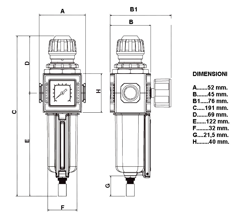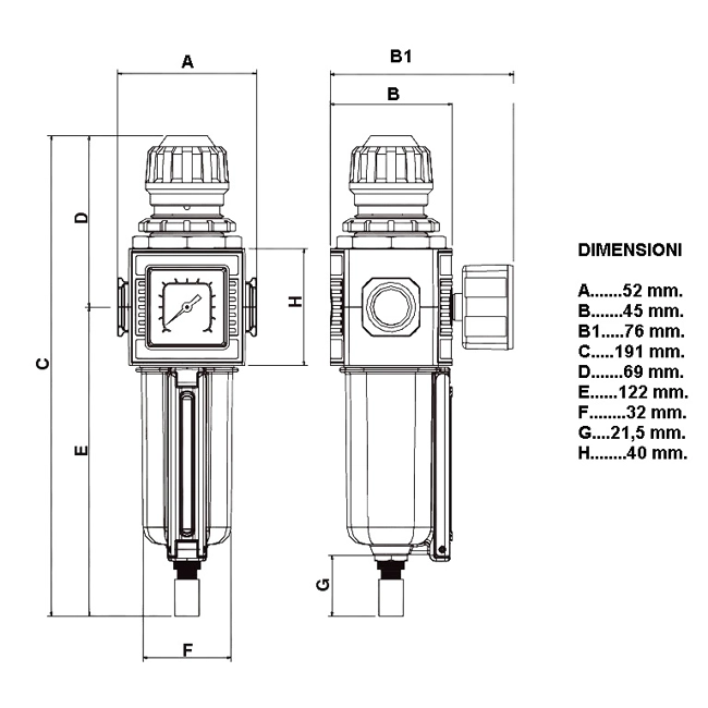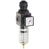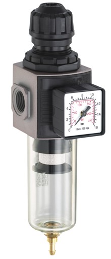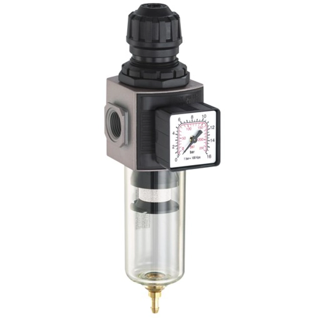 Questo filtro-regolatore riunisce in una singola unità la funzione di regolatore di pressione e di gruppo filtrante. E' un filtro modulare dotato di una cartuccia filtrante in PE che trattiene impurità con dimensioni superiori a 40 µ. La modularità permette di poter assemblare in un unico blocco, più elementi della stessa famiglia con funzioni diverse. CaratteristicheCorpo metallico verniciato con polveri epossidiche.Bicchiere con aggancio rapido in tecnopolimero con capacità di 20 cm³. Dispositivo di scarico semiautomatico. Deflettore e convogliatore d'aria per una efficace separazione della condensa. Sistema di regolazione della pressione a pistone. Valvola di scarico per sovrapressione, funzione relieving di serie. Pomello di regolazione munito di sistema di bloccaggio e ghiera di fissaggio in tecnopolimero. Manometro quadro con scala 0/16 bar - 0/230 psi. Fluido: aria compressaTemperatura di esercizio da -25° a +50° Filtrazione standard 40 µ Modello E/14/2