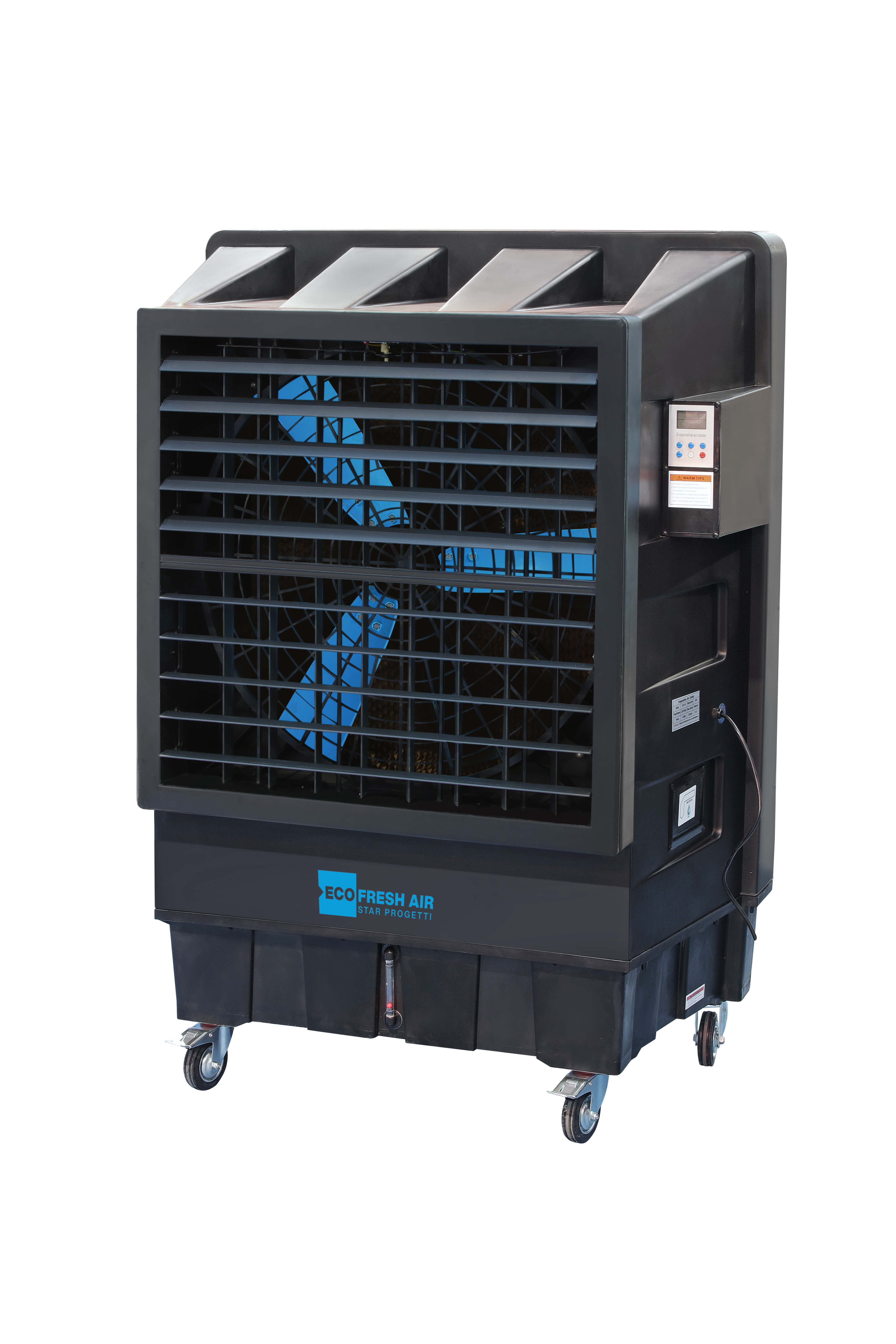 Raffrescatore Evaporativo con UV Antibatterico Eco Fresh Air - Codice FRE18001Il Rinfrescatore Industriale FRE18001 è la soluzione perfetta per industrie, capannoni, zone di lavoro e tensostrutture che richiedono un rinfrescamento efficace e potente.Con un impressionante flusso d'aria regolabile fino a 18000 m3/h, questo dispositivo è in grado di coprire un'area di circa 250/300 m2*, garantendo un ambiente confortevole e produttivo anche nelle condizioni più impegnative.Facile da Installare e Utilizzare: Il FREX18000 si posiziona facilmente ovunque, preferibilmente in prossimità delle aperture per massimizzare l'efficacia del rinfrescamento.Senza unità esterne e senza bisogno di installazione complicata, questo dispositivo può essere installato a parete, vicino alle finestre, utilizzando supporti e collegato alla rete idrica per un funzionamento ottimale.Ricambio d'Aria Filtrata per un Ambiente Salubre: Dotato di filtri antipolvere in cellulosa, il FREX18000 assicura un efficace ricambio d'aria filtrata, mantenendo l'ambiente libero da impurità e garantendo un'aria fresca e pulita in ogni momento. Inoltre, non nebulizza né distribuisce acqua nell'ambiente, proteggendo materiali delicati come metalli, carta e tessuti.Autonomia e Efficienza Energetica: Con una capacità del serbatoio d'acqua da 60 litri e un funzionamento fino a 6 ore circa, il FREX18000 offre un'ottima autonomia di funzionamento, adattandosi alle esigenze lavorative. I consumi energetici sono ottimizzati secondo la potenza utilizzata e le temperature ambientali, garantendo efficienza e risparmio.CaratteristichePannello di rinfrescamento evaporativo in cellulosa: maggior risparmio energetico più protezione ambientaleAlto comfort con una ventilazione silenziosa (Decibel . 68).Migliore distribuzione dell’aria con la ventilazione circolare (swing).Funzione TimerTelecomando per il controllo a distanza.3 livelli di velocità (alta-medio-bassa).Ampia capacità del serbatoio (60 L) per ridurre il numero dei riempimentiMobile con ruote dotate di freno.Cavo elettrico 3,20 m.Pannello LCD per il controllo immediato dei comandi.Avviso sonoro e visivo per un livello dell’acqua sempre ottimale.Copertura in tessuto per ricovero invernale.