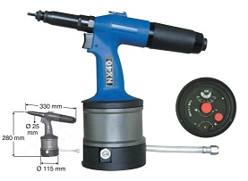 Rivettatrice oleopneumatica - articolo Sacto NX40S. Per inserti filettati da M6 a M12. Con regolazione di pressione. Testine fornite: M6, M8, M10, M12. Capacità rivetti in alluminio: da M6 a M12. Capacità rivetti in acciaio: da M6 a M12. Capacità rivetti in acciao inox: da M6 a M12.