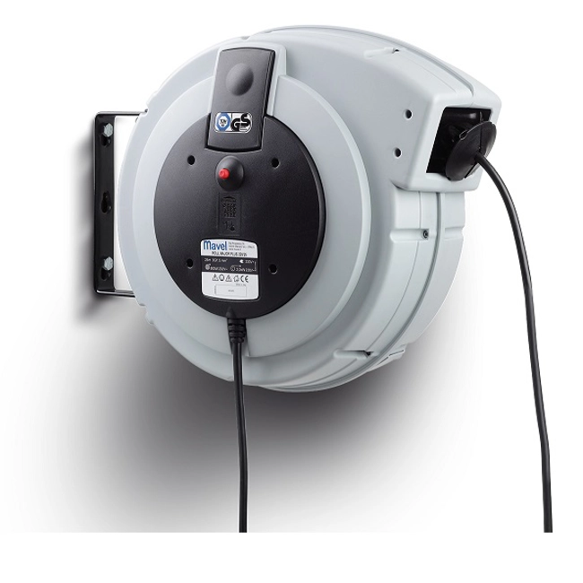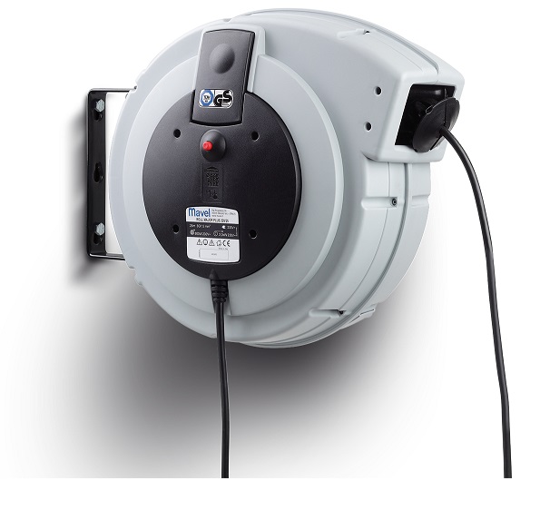 Avvolgitore Roll Major Plus 230V - Articolo Mavel 820705. Riavvolgimento automatico a molla. Struttura in materiale plastico antiurto. Staffa di fissaggio orientabile a parete in acciaio verniciato. Sistema di bloccaggio del cavo alla lunghezza desiderata, facilmente ispezionabile ed eliminabile da parte dell’utente. Predisposizione per accessorio Slow Motion, art.707200, che permette il rientro rallentato del cavo. MADE IN ITALY
