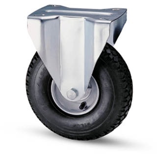 Ruota AVO 10252 - Rif.54A. Supporto di tipo medio in acciaio stampato zinco-cromato, rotante su doppia corona di sfere. Assemblaggio con dado autobloccante. Anello parapolvere sul giro di sfere. Ruota pneumatica, flange in acciaio. Piastra fissa.