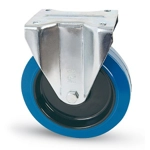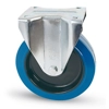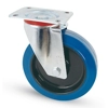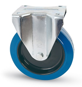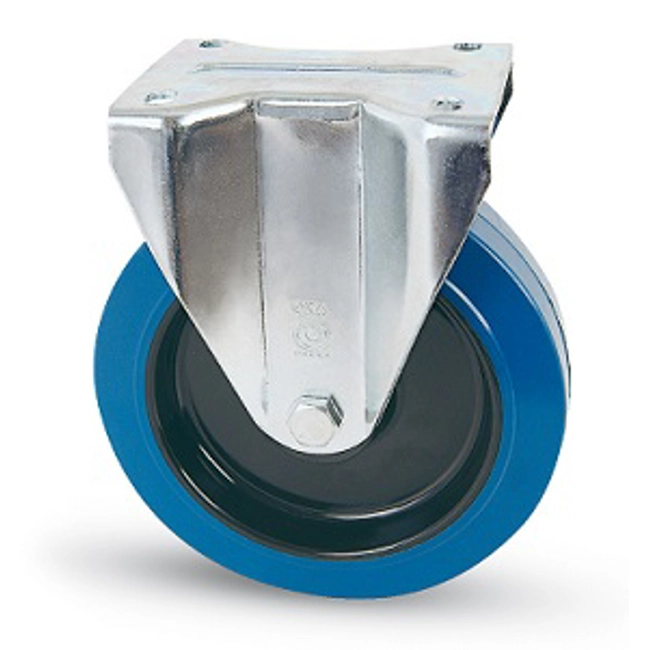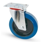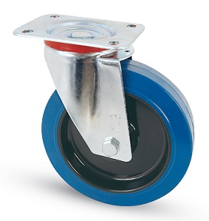 Ruota AVO - Rif.66. Supporto tipo medio in acciaio stampato zinco-cromato, rotante su doppia corona di sfere.Assemblaggio con dado autobloccante.Anello parapolvere sul giro di sfere.Ruota in gomma elastica, nucleo in poliammide 6.Colore blu.