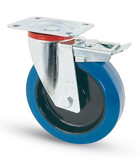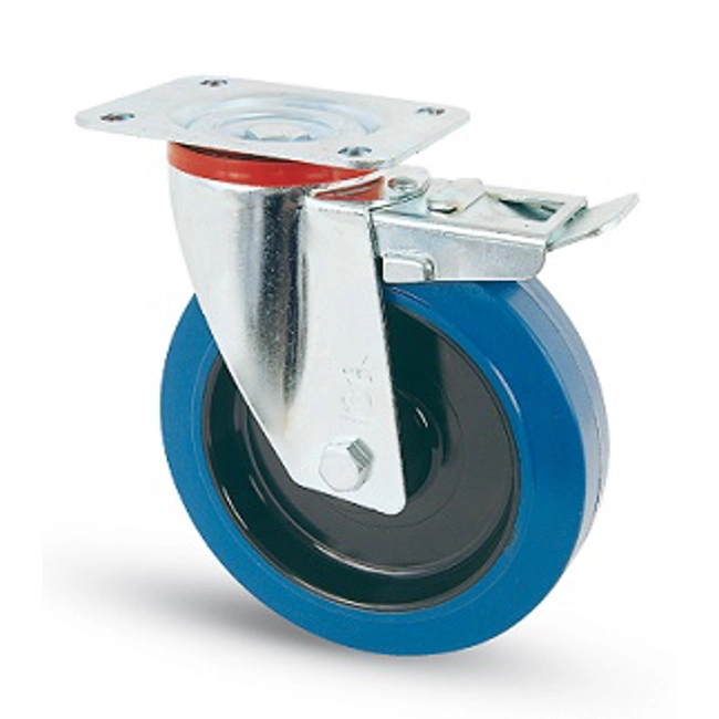 Supporto di tipo medio in acciaio stampato, zinco-cromato. Ruota in gomma elastica, nucleo in poliammide 6.