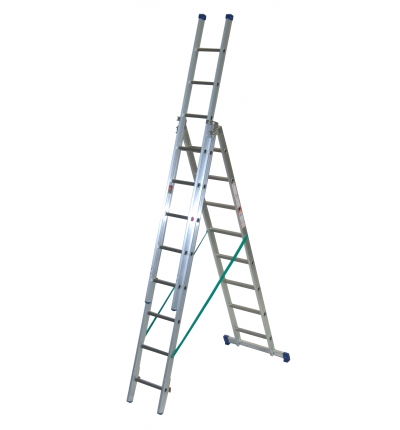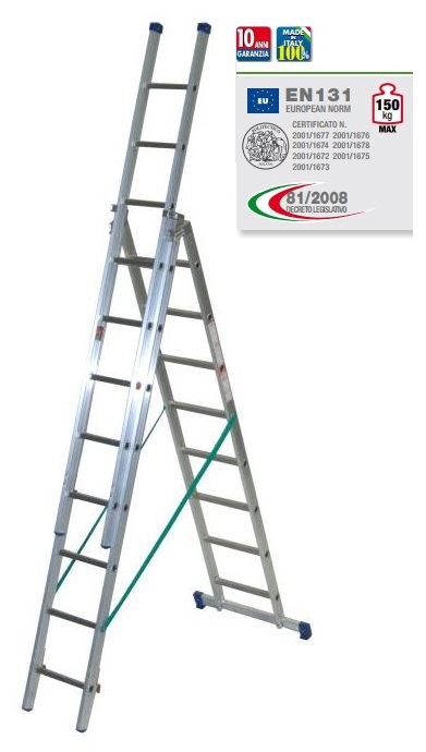 La SUPERSCALA PRIMA P260-3 gradini 7+8+8 è la scala allungabile a sfilo certificata e brevettata adatta al professionista. Rigorosamente conforme alla normativa europea EN131-1/2. Interamente in alluminio con cerniere d'acciaio ricoperte da mescole in nylon antiusura e resistenti agli agenti atmosferici. Scala a 3 rampe per arrivare ad altezze molto elevate. La barra stabilizzatrice telescopica è di serie su tutti i modelli, accessoriata con calzari in gomma antisdrucciolo ad inclinazione variata, rende la scala idonea all'utilizzo negli ambienti più sfavorevoli con falsopiano, pendenze, scalini, dossi... Possibilità di lavorare in totale sicurezza anche a cavalletto, gli arresti antisfilo sono montati su ramponi d'acciaio. I pioli con zigrinatura antiscivolo sono inclinati a 68° così che l'operatore mantenga una postura di lavoro corretta in fase di lavoro. Le ruote grigie antitraccia facilitano lo sfilo delle rampe in posizione verticale.