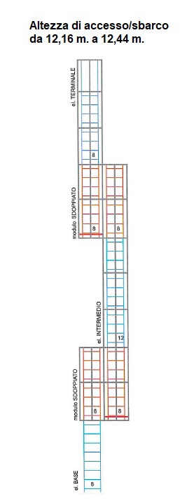 La scala ha un'altezza di accesso/sbarco da 12,16 m. a 12,44 m. ed è composta da: