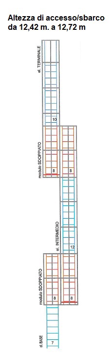 La scala ha un'altezza di accesso/sbarco da 12,42 m. a 12,72 m. ed è composta da:
