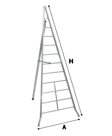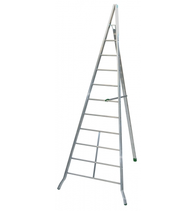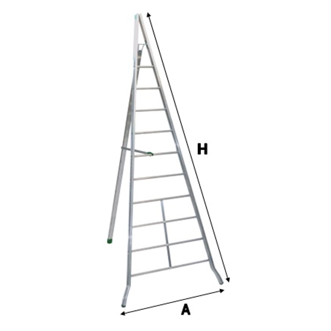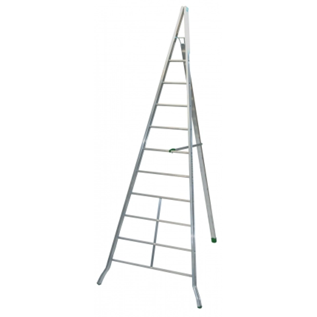 Scala agricola a 10 gradini, AGRI è scala in alluminio specifica per uso agricolo, per la manutenzione di piante e siepi oltre che la raccolta di frutta. I gradini a trapezio inclinato favoriscono le lunghe soste dei piedi che appoggiano in piano e non stancano le gambe, sono passanti al montante, ribordati e saldati per massima sicurezza strutturale. Il telaio di salita è ampiamente conico per la totale stabilità anche su terreni sconnessi. La scala termina a punta in alto per infilarsi nei rami.