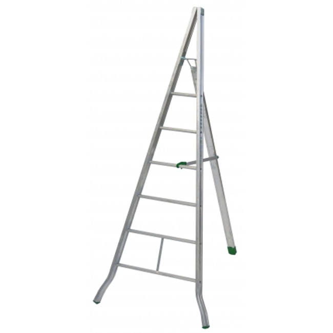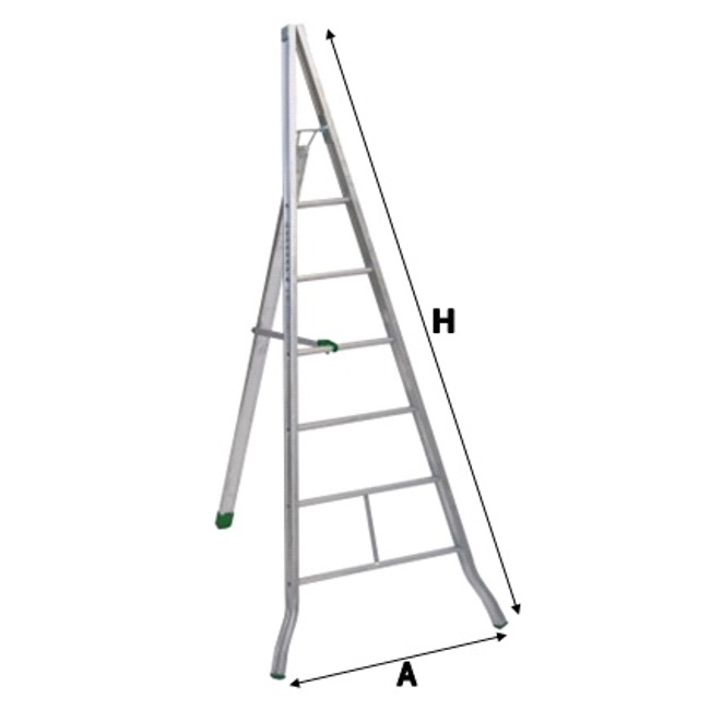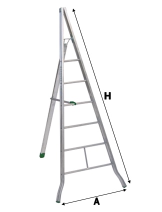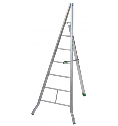 Scala agricola a 6 gradini, AGRI è scala in alluminio specifica per uso agricolo, per la manutenzione di piante e siepi oltre che la raccolta di frutta. I gradini a trapezio inclinato favoriscono le lunghe soste dei piedi che appoggiano in piano e non stancano le gambe, sono passanti al montante, ribordati e saldati per massima sicurezza strutturale. Il telaio di salita è ampiamente conico per la totale stabilità anche su terreni sconnessi. La scala termina a punta in alto per infilarsi nei rami.