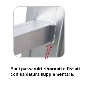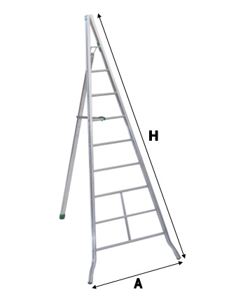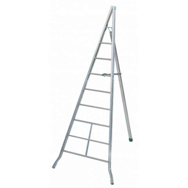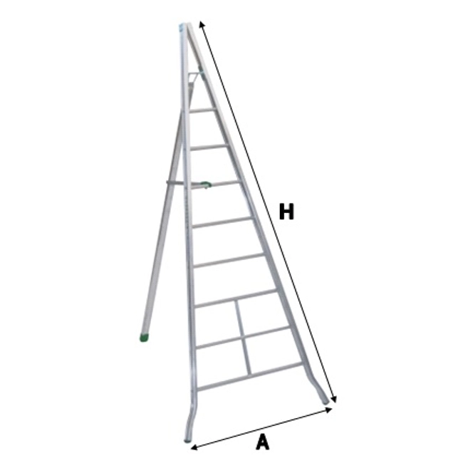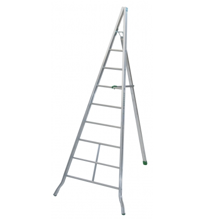 Scala agricola a 8 gradini, AGRI è scala in alluminio specifica per uso agricolo, per la manutenzione di piante e siepi oltre che la raccolta di frutta. I gradini a trapezio inclinato favoriscono le lunghe soste dei piedi che appoggiano in piano e non stancano le gambe, sono passanti al montante, ribordati e saldati per massima sicurezza strutturale. Il telaio di salita è ampiamente conico per la totale stabilità anche su terreni sconnessi. La scala termina a punta in alto per infilarsi nei rami.