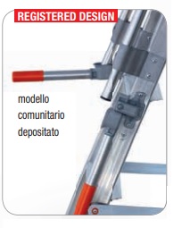 Rif. Facal QM-5. Scala da lavoro di dimensioni contenute con ruote inattive in presa solo dopo il sollevamento. Della parte anteriore. Maniglie ripieghevoli per il sollevamento del lato di salita. Mancorrenti di sicurezza più 10 cm. oltre la vaschetta superiore. Compassi in alluminio di grandi dimensioni a garenitre stabilità e compattezza durante l'uso e lo spostamento. Finiture plastiche : RAL 9004 nero. Maniglie: RAL 2004 arancio. Meccanismo delle maniglie Modello Comunitario Depositato. L'immagine è dimostrativa. Per il numero di scalini, leggere la scheda tecnica.
