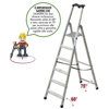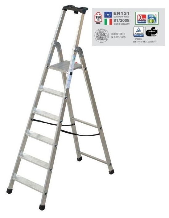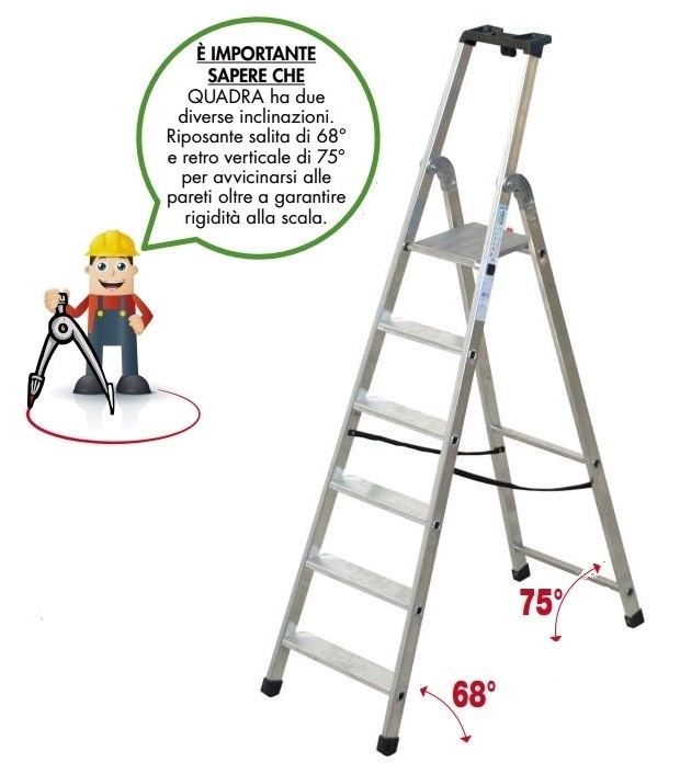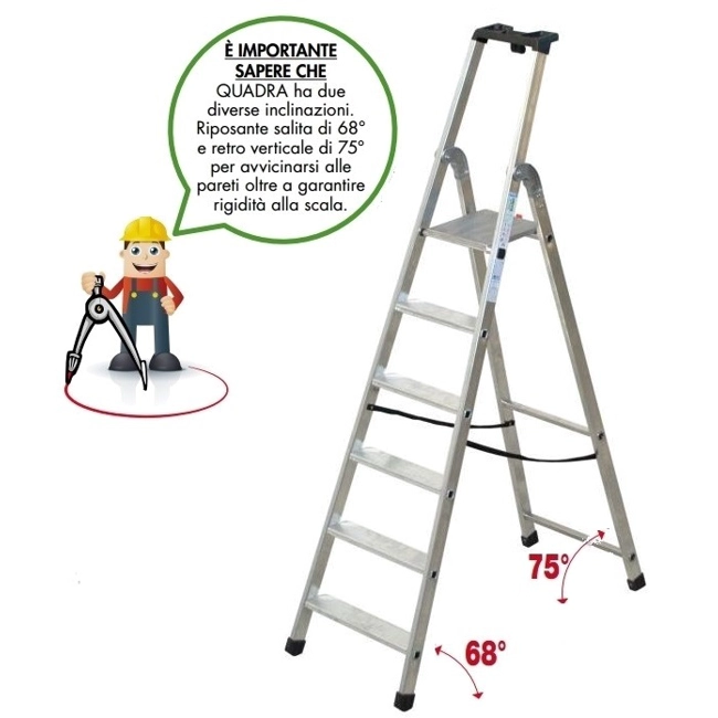 Rif. Facal Q50/6. Scala doppia interamente in alluminio particolarmente leggera e maneggevole, ideale per le donne; è la scala giusta per l'uso all'interno di case, appartamenti, uffici, negozi, magazzini. La Tecnoscala Quadra offre stabilità e sicurezza, facilità di spostamento avendo un ingombro minimo quando è chiusa, bastano massimo 15 cm. di spazio per riporla. La zigrinatura antiscivolo è presente sui gradini e sulla pedana che viene bloccata da un gancio di sicurezza in nylon, la presa anatomica sicura sulla vaschetta portaoggetti garantisce all'operatore di muoversi con stabilità e in totale sicurezza durante il lavoro. La certificazione EN131 permette l'impiego della Tecnoscala Quadra anche da parte del professionista. È importante sapere che Tecnoscala Quadra ha due diverse inclinazioni: riposante salita di 68° e retro verticale di 75° per avvicinarsi alle pareti oltre a garantire rigidità alla scala. Quando utilizzare la Tecnoscala Quadra. Per sostituire una lampadina, per il cambio tende, per la pulizia e la sistemazione di armadi, per riporre catalogare e ordinare su mensole e/o scaffali registri, raccoglitori.... Per la pulizia di vetrine, allestimento scaffali,soppalchi e per uso intensivo in magazzini industriali.Tecnoscala Quadra FACAL Q50/6 in alluminio a 6 gradini compresa la pedana.