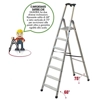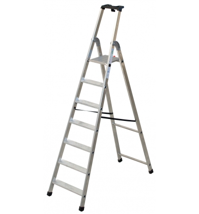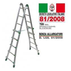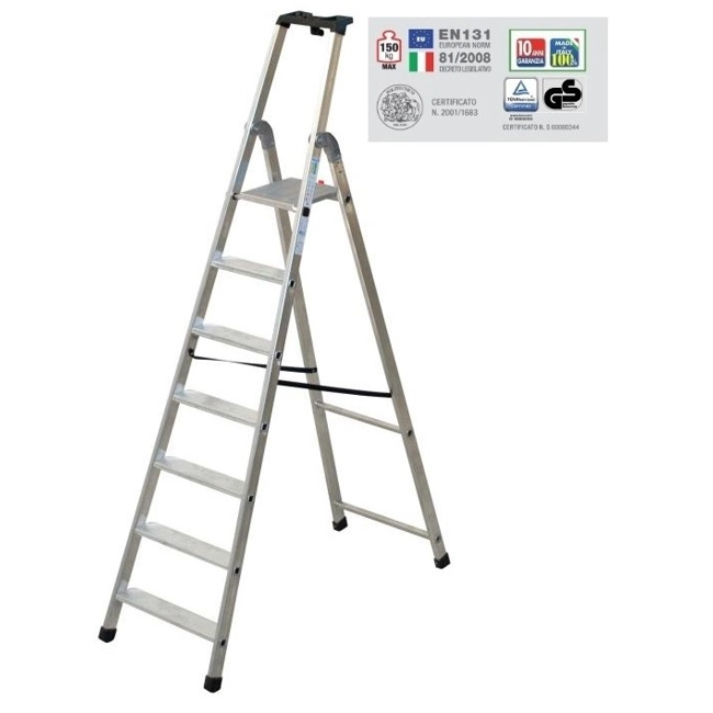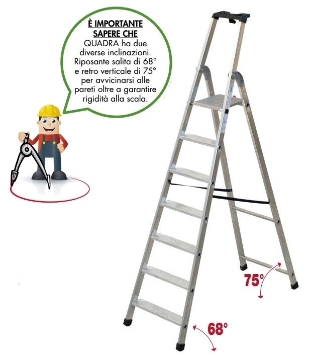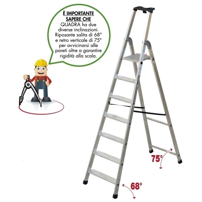 Rif. Facal Q50/7. Scala doppia interamente in alluminio particolarmente leggera e maneggevole, ideale per le donne; è la scala giusta per l'uso all'interno di case, appartamenti, uffici, negozi, magazzini. La Tecnoscala Quadra offre stabilità e sicurezza, facilità di spostamento avendo un ingombro minimo quando è chiusa, bastano massimo 15 cm. di spazio per riporla. La zigrinatura antiscivolo è presente sui gradini e sulla pedana che viene bloccata da un gancio di sicurezza in nylon, la presa anatomica sicura sulla vaschetta portaoggetti garantisce all'operatore di muoversi con stabilità e in totale sicurezza durante il lavoro. La certificazione EN131 permette l'impiego della Tecnoscala Quadra anche da parte del professionista. È importante sapere che Tecnoscala Quadra ha due diverse inclinazioni: riposante salita di 68° e retro verticale di 75° per avvicinarsi alle pareti oltre a garantire rigidità alla scala. Quando utilizzare la Tecnoscala Quadra. Per sostituire una lampadina, per il cambio tende, per la pulizia e la sistemazione di armadi, per riporre catalogare e ordinare su mensole e/o scaffali registri, raccoglitori.... Per la pulizia di vetrine, allestimento scaffali,soppalchi e per uso intensivo in magazzini industriali.Tecnoscala Quadra FACAL Q50/7 in alluminio a 7 gradini compresa la pedana.