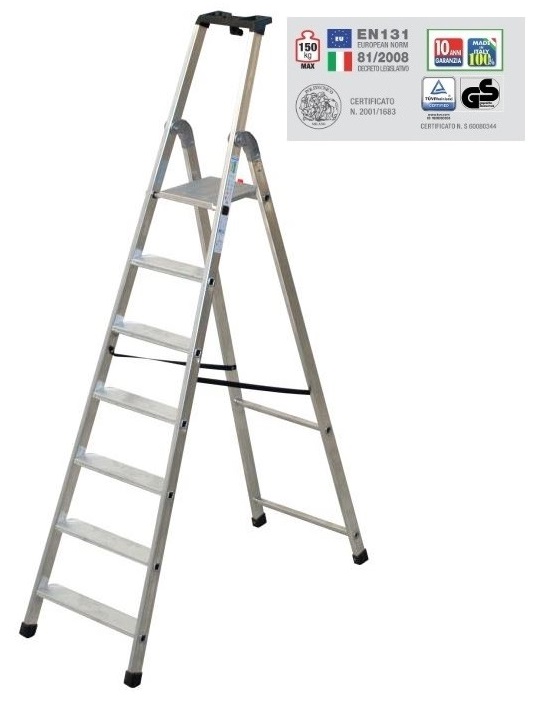 La scala è dotata di: Pedana di calpestio in alluminio fuso, vaschetta porta oggetti, cerniera in alluminio fuso, gancio di sicurezza per blocco pedana, gradini doppio bloccaggio senza rivetti, calzari in gomma antisdrucciolo per un solido appoggio. ACCESSORIO NON COMPRESO: COPPIA MANCORRENTI