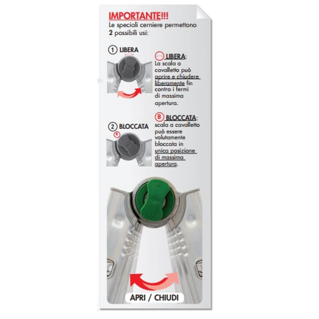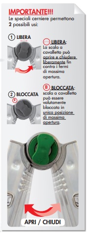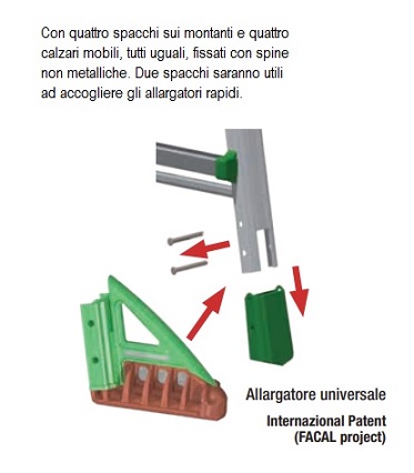 BK3A Scala con 4 gradini interni e 5 gradini esterni - Codice Facal BK/3A. Fornita con quattro spacchi sui montanti e quattro calzari mobili, tutti uguali, fissati con spine non metalliche. Due spacchi dello stesso lato servono ad accogliere gli allargatori universali.EUROBRIKO16 è scala universale, tutta in alluminio, di qualità tecniche superiori a conferma di prodotto unico. Cerniere fuse con anime d'acciaio incorporate inattaccabili da agenti atmosferici ed impossibili al cedimento (Brevetto). Ampie soluzioni d'utilizzo con opzione di libera a cavalletto che permette l'apri/chiudi strategico in ambienti ridotti.Gradini esterni fissati ognuno con 6 saldature robotizzate (3+3). Massimi sviluppi ottenuti dal progetto unico delle cerniere che portano i montanti alla massima lunghezza. ALLARGATORIRealizzati con anima di acciaio, ricoperta da componenti plastici di densità e durezza differenziata per iniezione. E' attivo il sistema PAH a tutela della non presenza di fattori tossici/nocivi. Le speciali cerniere permettono 2 possibili usi:LIBERA: la scala a cavalletto può aprire e chiudere liberamente fin contro i fermi di massima apertura.BLOCCATA: la scala a cavalletto può essere volutamente bloccata in un'unica posizione di massima apertura.