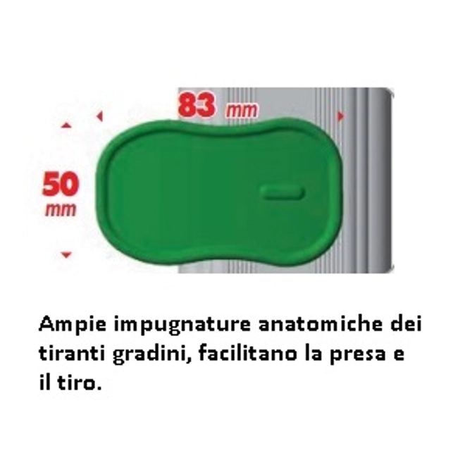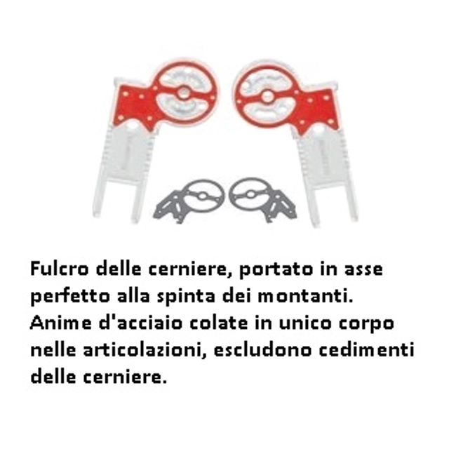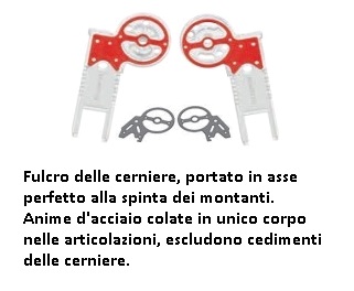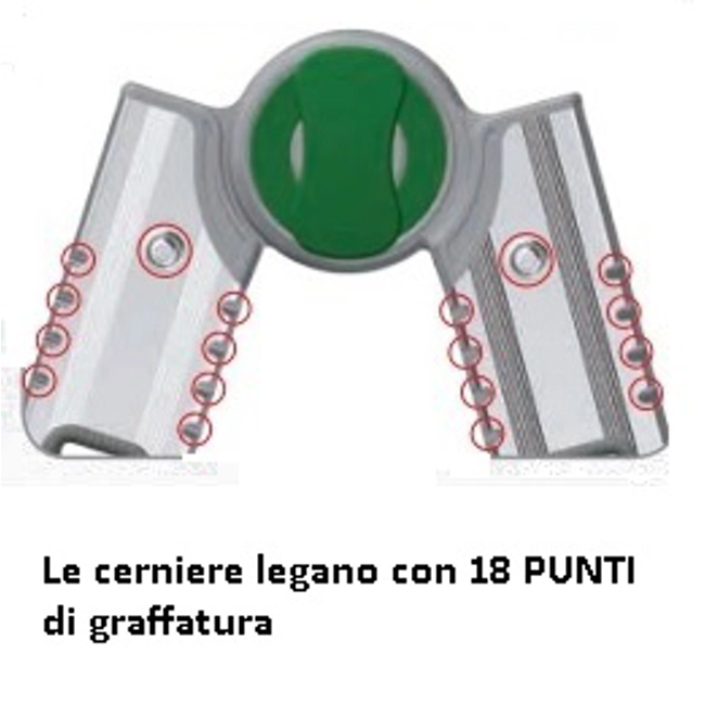 Punti di forza delle scale EUROBRIKO16: 1' punto: il taglio sagomato dei montanti permette di raggiungere la massima lunghezza in corrispondenza delle articolazioni. Le cerniere legano con 18 punti di graffatura idraulica ogni montante, fino a ottenere il serraggio più estremo.2' punto: solide articolazioni in alluminio fuso di sagoma, a seguire quella dei montanti per portarli con le estremità a contrastarsi di testa su un appoggio di ben 35mm. Senza precedenti! 3' punto: il fulcro delle cerniere, portato in asse perfetto alla spinta dei montanti, eleva la resistenza delle articolazioni al massimo livello progettuale. 4' punto: le anime di acciaio colate in unico corpo nelle articolazioni, escludono ogni possibile cedimento alle belle e pratiche cerniere fuse.5' punto: ampie impugnature anatomiche dei tiranti gradini facilitano la presa e il tiro.