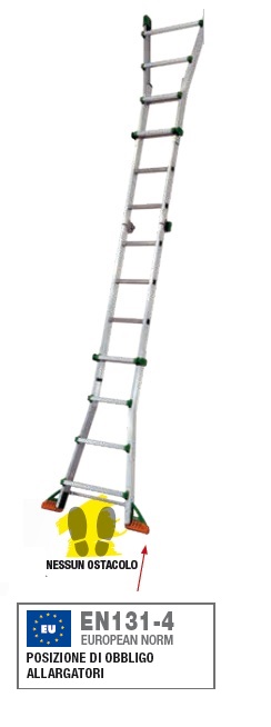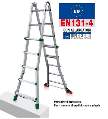 -NORMATIVA EUROPEA EN131-4 – CON ALLARGATORI. SOLO PER L'ITALIA, conformità solo al DLGS ITALIANO 81/2008. Non necessita l'applicazione dei due allargatori, la scala si utilizza con i quattro calzari mobili di dotazione iniziale. I due allargatori saranno presenti comunque e sempre nella confezione. Escluso BK/1 e BK/6. -Attestazione di conformità TÜV Italia No.: D 027944 0027