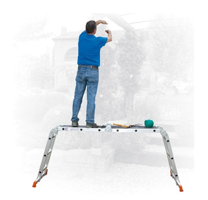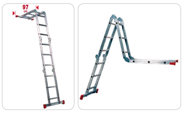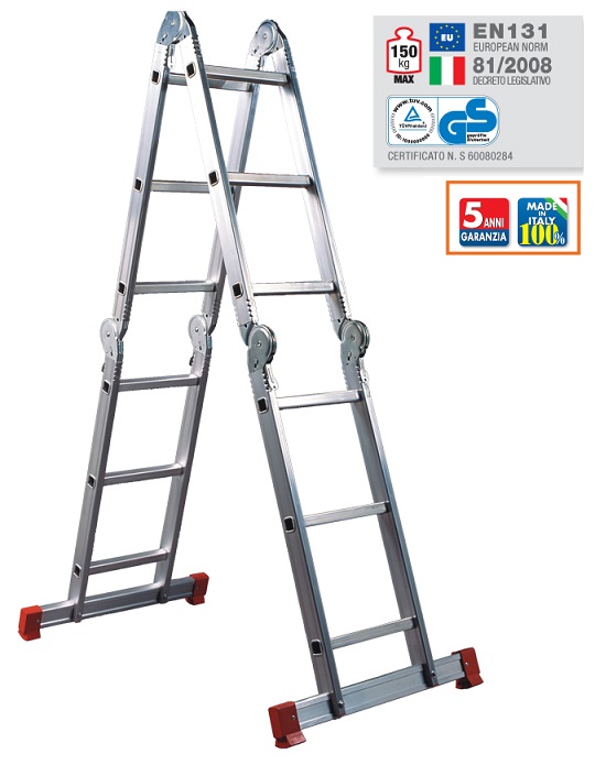 HOBBY SEI è scala multiposizioni d'alluminio composta da quattro elementi resi snodati da forti cerniere automatiche d'acciaio che permettono determinate importanti posizioni. Ottimo strumento di lavoro, flessibile nelle applicazioni e compatta. Facile da riporre, sempre pronta all'uso, le articolazioni automatiche d'acciaio sono fissate ai montanti senza viti e senza rivetti. Accessorio pianetto pieghevole fornito a parte (codice H6/P)
