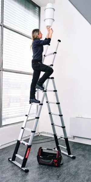 totale massima a cavalletto 300 cm.scala chiusa 79 cm.Di lavoro alla mano considerando di tenere 60 cm. di parapetto: 380 cm.