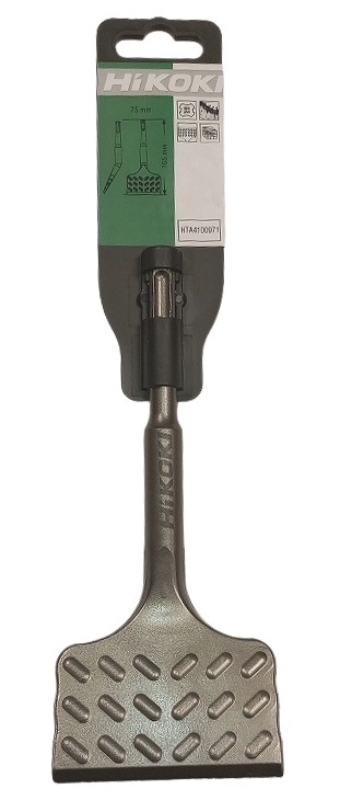Scalpello extra piatto (inclinato) - Codice HiKOKI HTA4100971. Attacco SDS plus. Scalpello ad alta demolizione, specifico per la rimozione delle piastrelle dal pavimento. Design brevettato che riduce l'attrito, incrementa le prestazioni di demolizione e previene l'inceppamento, riducendo i tempi morti. L’affilatura dura nel tempo, assicurando una maggior vita di servizio rispetto alla serie standard.
