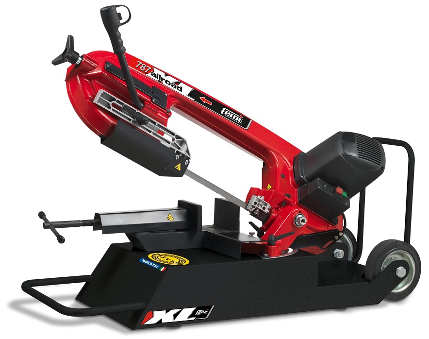 Art. Femi 8.48.70.23. SEGA NASTRO FEMI 787 XL All Road Segatrice a nastro trasportabile con base su ruote. Una nuova soluzione per il taglio dei metalli in cantieri o in posti di lavoro che necessitino di spostamento continuo. La nuova segatrice a nastro 787 XL All Road è dotata di basamento con ruote integrate e maniglione di trasporto che ne rendono facile lo spostamento da un posto di lavoro ad un altro. Il rivoluzionario sistema di braccio roto-traslante (patent pending) le consente di poter tagliare pezzi di dimensioni fino a mm 213x150 pur mantenendo dimensioni compatte. Segatrice della famiglia XL, è l’ideale connubio tra prestazioni (eccezionali capacità di taglio e potenza) e le massime trasportabilità e versatilità d’impiego.