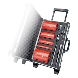 KIT CORONE A SECCO PER CEMENTO Codice EDSET04000.Set di corone diamantate a secco per cemento armato e calcestruzzo - DRY BETON.Le corone Diamantate DRY BETON sono ideali per forare velocemente ed efficacemente: cemento armato, solette, calcestruzzo e prefabbricati in cemento.Vanno utilizzata la micro-percussione e l'aspirazione.La scanalatura a spirale esterna assicura un migliore scarico ed un efficace raffreddamento.Segmenti diamantati TT (turbo segmenti con tecnologia Diatex®) per un'eccellente performance ed un'ottima durata.