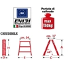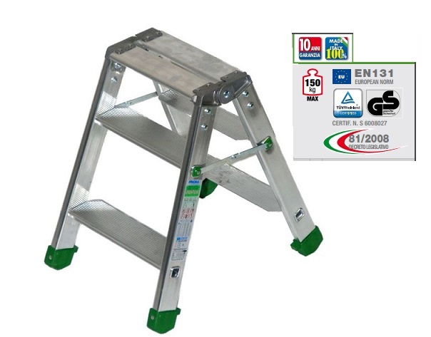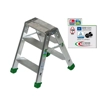 Sgabello DUPLA con scalini da entrambi i lati fissati ai montanti con doppio passaggio idraulico senza rivetti. Questo modello D2 ha 2 gradini + pianetto, un pratico appoggio di seduta che permette di lavorare con le mani libere in sicurezza. DUPLA sgabello è leggero e non ingombrante inoltre gli scalino profondi 85 mm.lo rendono uno sgabello sicuro e utilizzabile da professionisti per un uso intensivo. Le cerniere monoblocco sono in alluminio fuso e i compassi antichiusura o antidivaricamento sono in acciaio. Nota: non conforme alla parte 3 della Norma EN131.