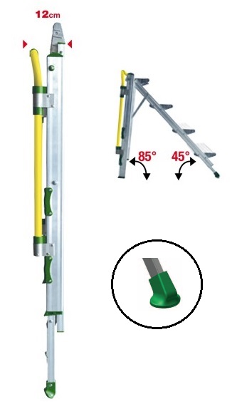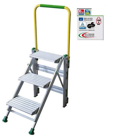 PLIO Sgabello professionale tutto in alluminio, pieghevole e con 3 gradini larghi 37x23 cm. Ha un'unica salita con comoda inclinazione a 68° ed è munito di paracorpo. 100% MADE IN ITALY. Portata max 150 Kg. Utilizzabile per uso professionale intensivo.