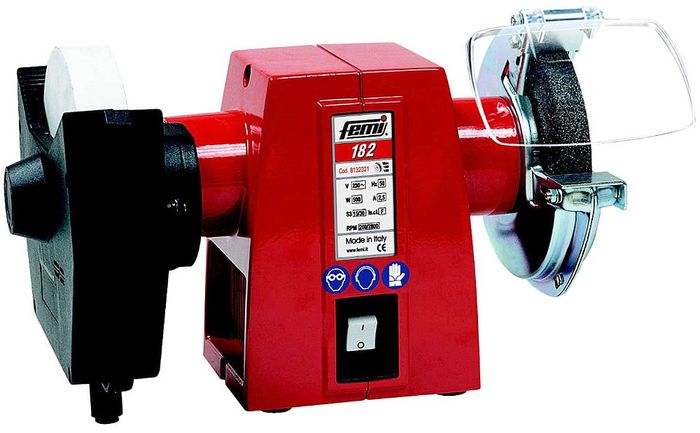Art. Femi 8.13.23.21. Smerigliatrice affilatrice 182 PLUS. Macchina dotata di due mole coassiali ruotanti a velocità differenziata; mola smerigliatrice adatta a tutte le comuni operazioni di smerigliatura e sbavatura; mola affilatrice a giri lenti a bagno d’acqua che permette l’affilatura di forbici, coltelli, scalpelli e lame in genere. Conforme alle normative CE.