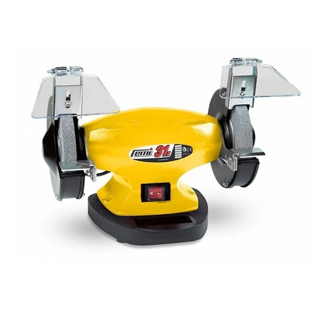 Art. Femi 8.11.02.22. Smerigliatrice da banco, doppia mola diam. 150 mm. - Modello BG 31N. Riservata agli hobbisti più esigenti, è dotata di un potente e silenzioso motore monofase ad induzione. La macchina è stata progettata e costruita per operazioni di asportazione di materiale (smerigliatura o affilatura di utensili) e/o pulitura, di qualsiasi tipo di metallo o materiali simili, nelle quali il pezzo in lavorazione viene tenuto in mano. E' dotata di: parascintille trasparente, cuffia di protezione, poggiapezzi, paraschegge regolabile, vaschetta acqua. CertificazioniE' conforme alle disposizioni della Direttiva 2006/42/CE e alle disposizioni di attuazione. Inoltre è conforme alle seguenti disposizioni e relative attuazioni: 2014/30/UE, 2014/35/UE, 2011/65/UE, 202/19/UE. Normativa CE.