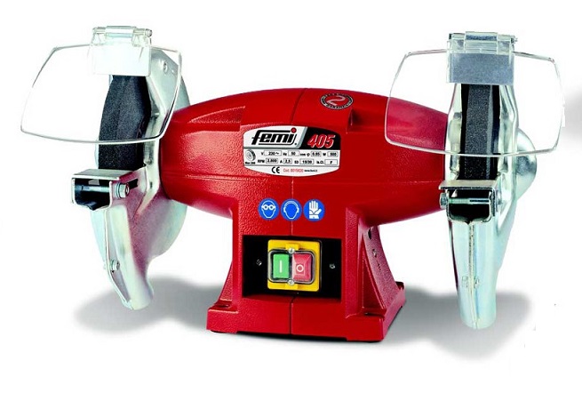 Art. Femi 8.01.56.20. Smerigliatrice professionale da banco a doppia mola art.405. Caratteristiche tecniche Corpo in alluminio rinforzato. Motore a induzione, monofase da 500W, affidabile e silenzioso. Mola diametro 200 mm, ideale per l'impiego in campo artigianale e professionale. Utilizzabile con due mole abrasive per la smerigliatura (velocità mola 2800 giri/min) con grana differenziata. Possibilità di lavorare sul piano o sulla ruota gommata. Completa di protezioni antinfortunistiche e attacco per aspirazione. Dotata di interruttore START-STOP con funzione antiripristino di sicurezza. Conforme alla Normativa CE.