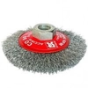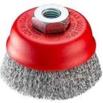 Spazzola conica per smerigliatrice angolare - Rif. 0175. La forma conica rende queste spazzole adatte per lavori "di taglio" su superfici irregolari, con spigoli, profili e fessure. In acciaio ondulato ad altissima resistenza. Indicazioni generali LA SCELTA DELLA FORMA DEL PRODOTTO DIPENDE DALLA SUPERFICIE SULLA QUALE SI LAVORA: -Tazza: per lavorazioni su superfici piane. -Conica: per superfici ad angolo o a spigolo, lavora meglio di "taglio". -Circolare: per lavorare di taglio su superfici strette, sporgenti o incavate (cordoni di saldatura o teste di tubo). FILAMENTI La tipologia e la formazione del filamento determinano il tipo di finitura e lavorazione desiderata: -Acciaio Ondulato: Lavori leggeri, piccole scorie e ruggine, sbavature leggere. -Acciaio a Mazzetti Ritorti: Azione aggressiva per lavori pesanti come trattamento saldature e sbavature consistenti. -Cordicella Ottonata Liz: Lavori di irruvidimento, ideale su gomma e pneumatici. -Acciaio Inossidabile: Applicazioni su acciaio inox, alluminio e metalli non ferrosi perché non rilascia residui ossidanti. -Ottone: Lavori su superfici in ottone e rame. Assenza di scintille.-Nylon Abrasivo: Varie applicazioni a seconda della grana su alluminio, acciaio, ghisa, legno, marmo e pietre.