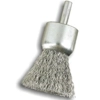 Spazzole a pennello con gambo per trapano - RIF.0807. In acciaio ondulato ad alta resistenza ed altissima densità di filo, per lavori frontali con utensili elettrici e ad aria. Indicazioni generali LA SCELTA DELLA FORMA DEL PRODOTTO DIPENDE DALLA SUPERFICIE SULLA QUALE SI LAVORA: -Tazza: per lavorazioni su superfici piane.-Conica: per superfici ad angolo o a spigolo, lavora meglio di "taglio". -Circolare: per lavorare di taglio su superfici strette, sporgenti o incavate (cordoni di saldatura o teste di tubo). FILAMENTI La tipologia e la formazione del filamento determinano il tipo di finitura e lavorazione desiderata: -Acciaio Ondulato: Lavori leggeri, piccole scorie e ruggine, sbavature leggere. -Acciaio a Mazzetti Ritorti: Azione aggressiva per lavori pesanti come trattamento saldature e sbavature consistenti. -Cordicella Ottonata Liz: Lavori di irruvidimento, ideale su gomma e pneumatici. -Acciaio Inossidabile: Applicazioni su acciaio inox, alluminio e metalli non ferrosi perché non rilascia residui ossidanti. -Ottone: Lavori su superfici in ottone e rame. Assenza di scintille. -Nylon Abrasivo: Varie applicazioni a seconda della grana su alluminio, acciaio, ghisa, legno, marmo e pietre.