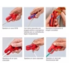 KNIPEX ErgoStrip®. Utensile spelacavi universale. Design multicomponente con inserto in morbida resina sintetica per una comoda maneggevolezza e una presa sicura. Caratteristiche Corpo in stabile resina sintetica rinforzata con fibra di vetro.Struttura innovativa e ergonomica con manico a pistola per l'intaglio, la spelatura e un taglio longitudinale facile del rivestimento. Punta conica, sottile per un migliore accesso in spazzi ristretti. Dispositivo spelacavi per le sezioni 0,2 / 0,3 / 0,8 / 1,5 / 2,5 / 4 mm². Inserimento facilitato di conduttori unipolari per la spelatura grazie ai divisori di posizionamento. Con molla di ritorno e nottolino di arresto. Facile inserimento di cavi coassiali e per trasmissione dati grazie all'ausilio di apertura.