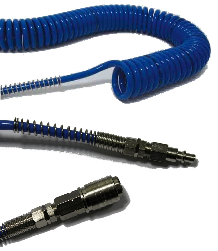 Spirale poliuretano con raccordo maschio girevole. Colore standard azzurro. Temperatura di utilizzo da -20°C a +60°C