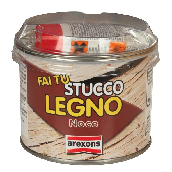 Fai tu stucco legno Noce 200 gr - Codice 3007.Pasta bicomponente facilmente lavorabile a base di resine poliestere. Adatto a eseguire qualsiasi tipo di intervento come ricostruzioni di parti mancanti anche di grosse dimensioni, stuccature e rifiniture su supporti in legno.È possibile ottenere qualsiasi spessore finale applicando più strati di prodotto successivi.Dopo l'indurimento può essere segato, piallato, forato, carteggiato, esattamente come fosse legno.È riverniciabile con la maggior parte degli smalti e mordenti normalmente in commercio.Tutte le tinte della gamma sono miscelabili per ottenere tonalità intermedie.